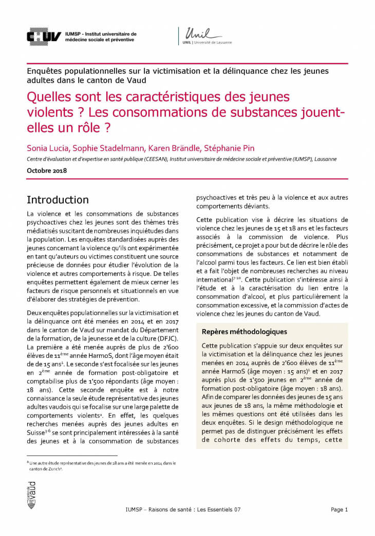 La violence et les consommations de substances psychoactives chez les jeunes sont des thèmes très médiatisés suscitant de nombreuses inquiétudes dans la population. Les enquêtes standardisées auprès des jeunes concernant la violence qu’ils ont expérimentée en tant qu’auteurs ou victimes constituent une source précieuse de données pour étudier l’évolution de la violence et autres comportements à risque. De telles enquêtes permettent également de mieux cerner les facteurs de risque personnels et situationnels en vue d’élaborer des stratégies de prévention.