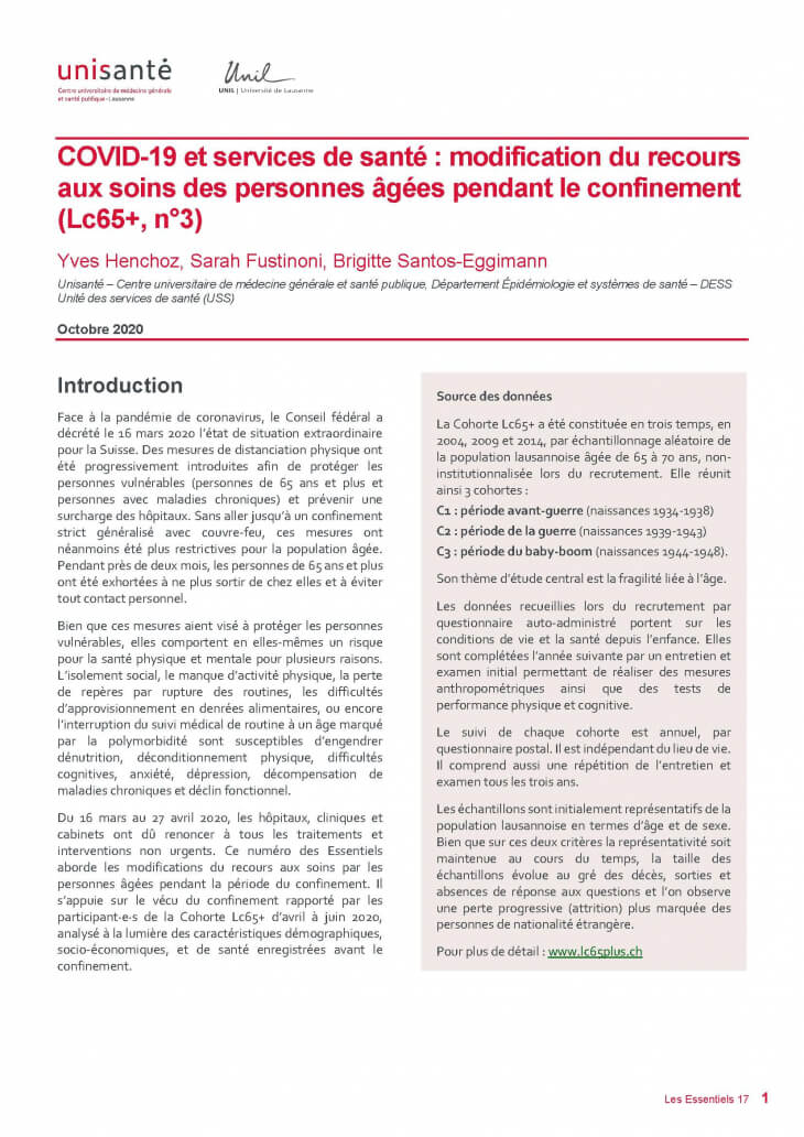 Du 16 mars au 27 avril 2020, les hôpitaux, cliniques et cabinets ont dû renoncer à tous les traitements et interventions non urgents. Ce numéro des Essentiels aborde les modifications du recours aux soins par les personnes âgées pendant la période du confinement. Il s’appuie sur le vécu du confinement rapporté par les participant·e·s de la Cohorte Lc65+ d’avril à juin 2020, analysé à la lumière des caractéristiques démographiques, socio-économiques, et de santé enregistrées avant le confinement.