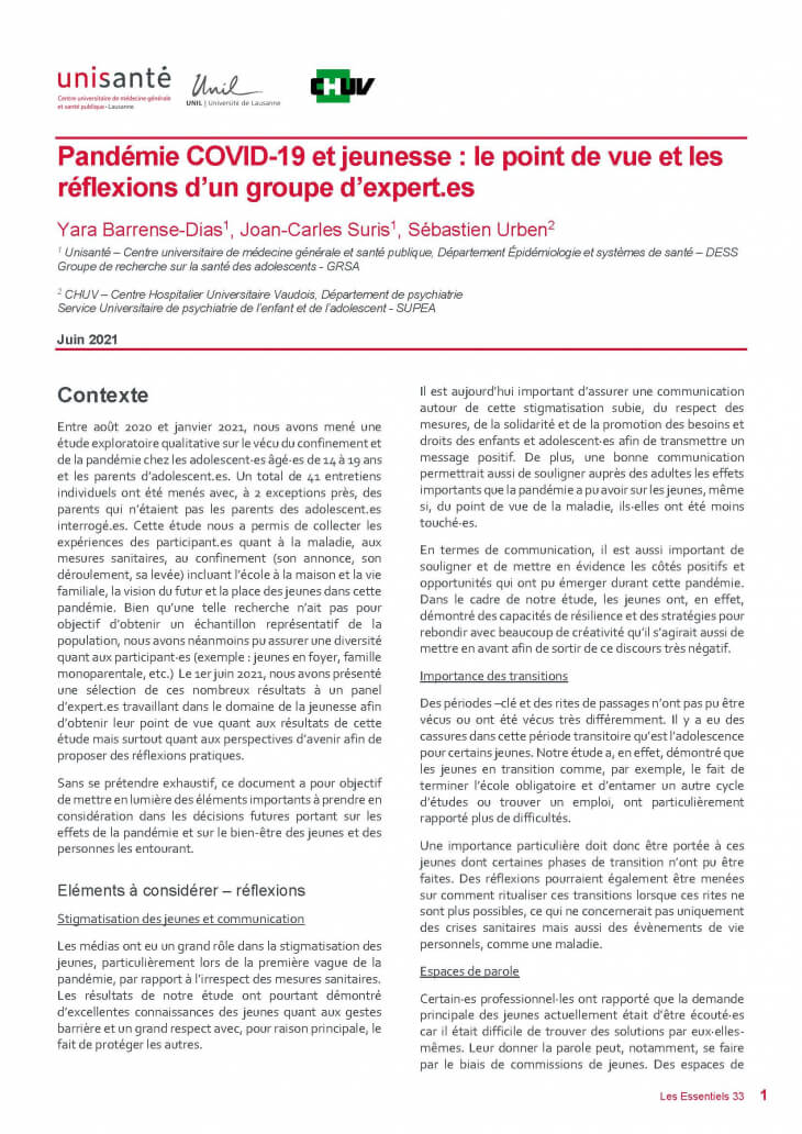 Pandémie COVID-19 et jeunesse: le point de vue et les réflexions d’un groupe d’expertes et d'experts