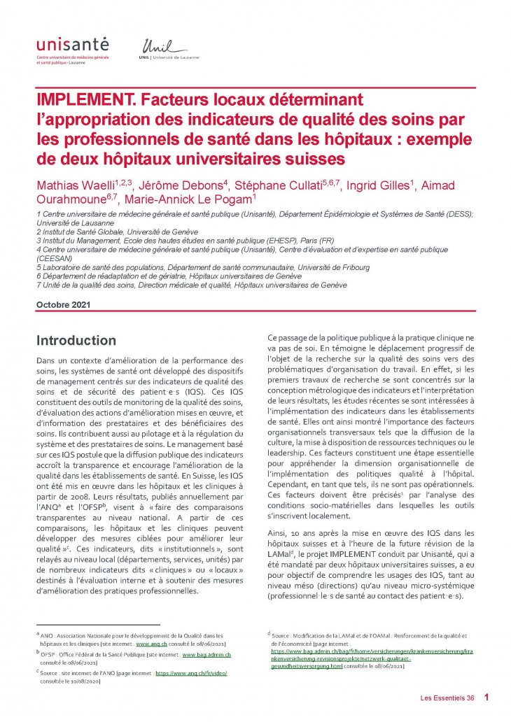 IMPLEMENT: Facteurs locaux déterminant l’appropriation des indicateurs de qualité des soins par les professionnels de santé dans les hôpitaux, exemple de deux hôpitaux universitaires suisses