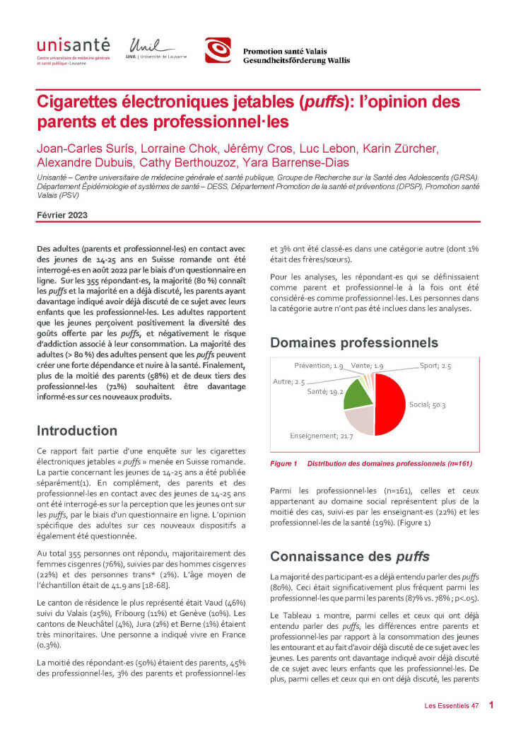 Des adultes (parents, professionnelles et professionnels) en contact avec des jeunes de 14-25 ans en Suisse romande ont été interrogés en août 2022 par le biais d’un questionnaire en ligne. Sur les 355 personnes répondantes, la majorité (80%) connaît les puffs et la majorité en a déjà discuté, les parents ayant davantage indiqué avoir déjà discuté de ce sujet avec leurs enfants que les professionnelles et professionnels. Les adultes rapportent que les jeunes perçoivent positivement la diversité des goûts offerte par les puffs, et négativement le risque d’addiction associé à leur consommation. La majorité des adultes (> 80%) des adultes pensent que les puffs peuvent créer une forte dépendance et nuire à la santé. Finalement, plus de la moitié des parents (58%) et de deux tiers des professionnelles et des professionnels (71%) souhaitent être davantage informés sur ces nouveaux produits.