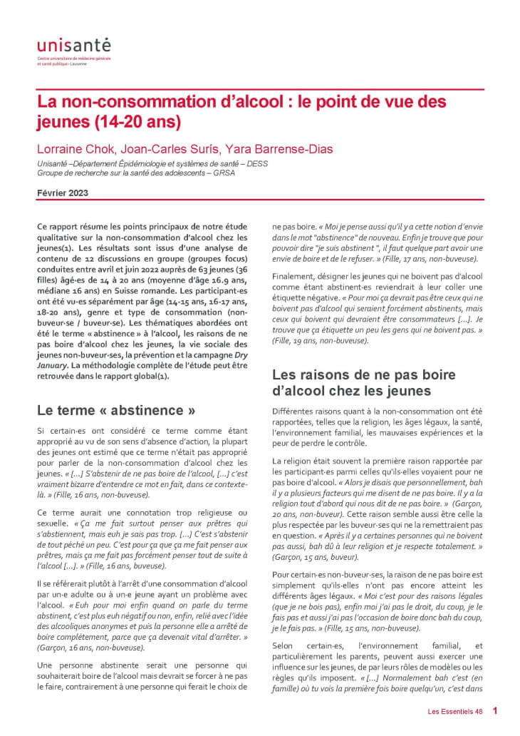 Ce rapport résume les points principaux de notre étude qualitative sur la non-consommation d’alcool chez les jeunes. Les résultats sont issus d’une analyse de contenu de 12 discussions en groupe (groupes focus) conduites entre avril et juin 2022 auprès de 63 jeunes (36 filles) âgé·es de 14 à 20 ans (moyenne d’âge 16.9 ans, médiane 16 ans) en Suisse romande. Les participantes et participants ont été vus séparément par âge (14-15 ans, 16-17 ans, 18-20 ans), genre et type de consommation (non-buveur·se / buveur·se). Les thématiques abordées ont été le terme «abstinence» à l’alcool, les raisons de ne pas boire d’alcool chez les jeunes, la vie sociale des jeunes non-buveur·ses, la prévention et la campagne Dry January. La méthodologie complète de l’étude peut être retrouvée dans le rapport global.