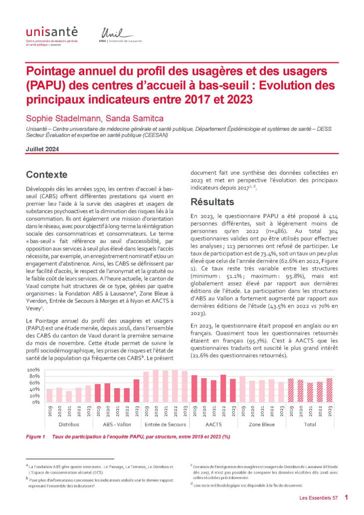 Le Pointage annuel du profil des usagères et usagers (PAPU) est une étude menée, depuis 2016, dans l’ensemble des CABS du canton de Vaud durant la première semaine du mois de novembre. Cette étude permet de suivre le profil sociodémographique, les prises de risques et l’état de santé de la population qui fréquente ces CABS. Le présent document fait une synthèse des données collectées en 2023 et met en perspective l’évolution des principaux indicateurs depuis 2017.
