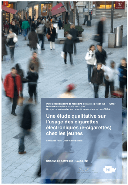 La cigarette électronique (E-cigarette) est un phénomène relativement récent qui est en train de prendre une ampleur inattendue, surtout chez les jeunes. La littérature scientifique à ce sujet est encore relativement rare et surtout centrée sur les taux de prévalence. Bien que théoriquement conçues pour les adultes qui voudraient arrêter de fumer, les adolescents sont devenus un public cible pour ces produits, dont beaucoup n'ayant jamais fumé de cigarettes traditionnelles.Du point de vue de la santé publique, une des préoccupations majeures correspond au possible effet indésirable des cigarettes électroniques d'inciter les jeunes au tabagisme. Beaucoup de questions restent sans réponse quant à l'impact des cigarettes électroniques sur la santé publique. Par exemple, il n'est pas clair si les cigarettes électroniques sont juste une nouveauté que les jeunes n'essayent qu'une fois ou si elles ont le potentiel de concurrencer les cigarettes traditionnelles. Même si les cigarettes électroniques sont disponibles en Suisse depuis près de 10 ans, peu de données existent quant aux motifs de consommation des jeunes, les modalités de consommation, les effets recherchés et la perception de leur nocivité. [...]