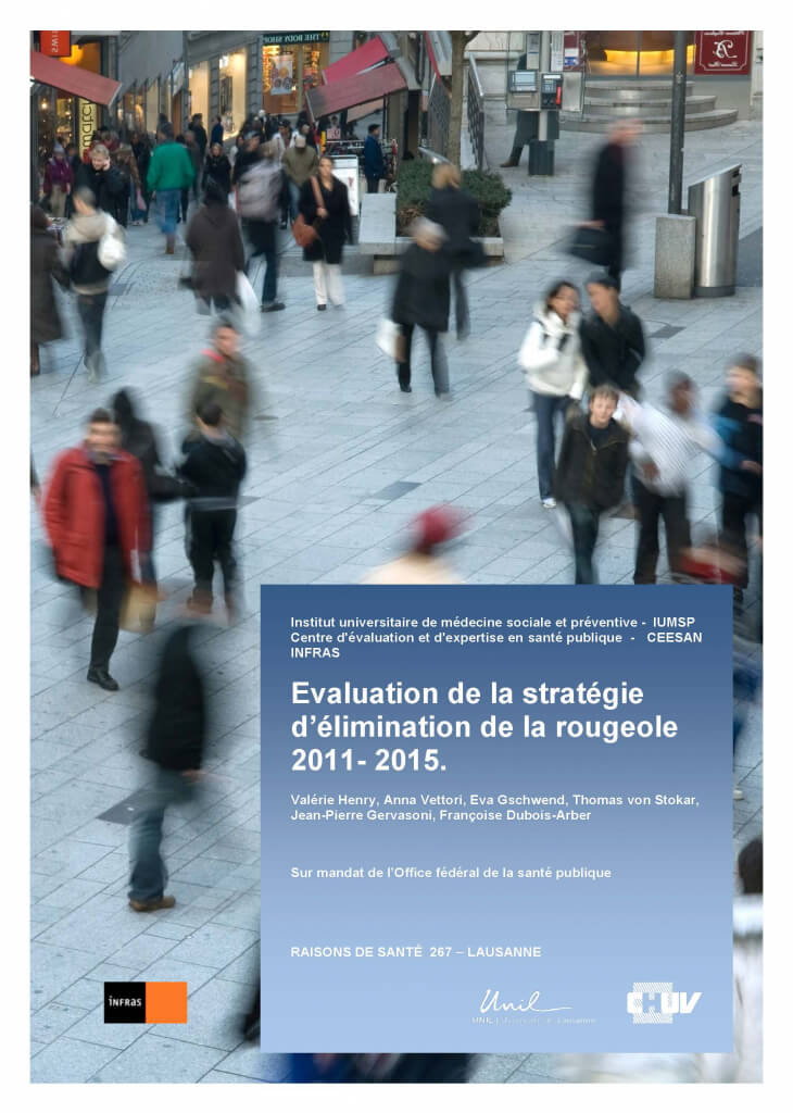 La stratégie d’élimination de la rougeole 2011-2015 élaborée et mise en oeuvre par l’OFSP a été évaluée en utilisant diverses approches méthodologiques complémentaires. Les principaux résultats montrent qu’un large consensus sur la stratégie a été obtenu sous l’impulsion de l’OFSP et que tous les cantons ont mis en oeuvre des mesures visant à augmenter la couverture vaccinale. Une augmentation de la couverture vaccinale, du rattrapage vaccinal et une réduction des disparités cantonales de couverture vaccinale ont été observées. Cependant l’objectif stratégique de couverture vaccinale 2 doses à l’âge de 2 ans n’a pas été obtenu dans tous les cantons pour lesquels on dispose d’une mesure en 2014-2015. Il est probable que la stratégie n’a pas encore déployé tous ses effets. Les mesures mises en oeuvre pour prévenir et contenir les flambées épidémiques et qui visent à augmenter la couverture vaccinale devraient être poursuivies.